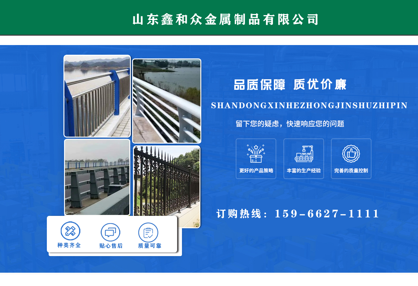山東鑫和眾金屬制品有限公司主要產品有防撞護欄,橋梁護欄,道路護欄,河道護欄,不銹鋼護欄等護欄。提供設計方案,一站式定制,包您滿意價格優惠,歡迎來電咨詢! 公司常年從事銷售護欄防撞護欄,橋梁護欄,道路護欄,河道護欄,不銹鋼護欄,橋梁鋼護欄,河道燈光護欄等。產品廣泛應用于橋梁、河道、旅游景區、道路、公路、公園、小區、景觀、道路防撞等領域?! 」井a品均采用優質不銹鋼材料,符合相關標準。各種型號不銹鋼復合管及護欄,質量嚴格把控。產品強度高、耐腐蝕、焊接牢固、抗沖擊、性能好,防撞護欄結構簡單、美觀實用大方?! g迎前來訂購!...